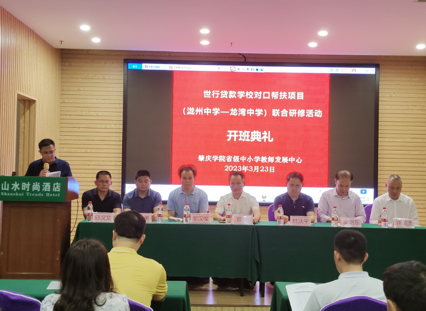3月23日下午,省教育厅世行贷款公司对口帮扶项目(泷州中学-龙湾中学) 联合研修班在肇庆山水酒店7楼会议室如期举行开班典礼。yc33455cc副经理曾毅教授、罗定市教师发展中心教研部黎汉俊主任、泷州中学及龙湾中公司领导与老师出席了开班仪式。