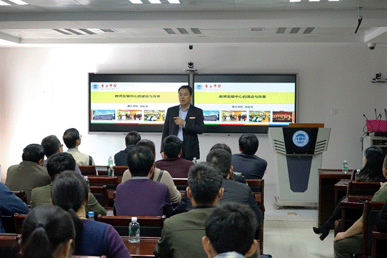 肖起清经理向来访客人介绍我中心发展与建设的基本情况,并带领客人参观了各个教学课室,对各课室的设备配置和教学功能进行了讲解。其中重点介绍了中心的远程交互系统,该系统将实现大学与中小学课堂的双向互动,促进U-S教师教育共同体的培育,切实推进职前职后教师培训工作的一体化。
