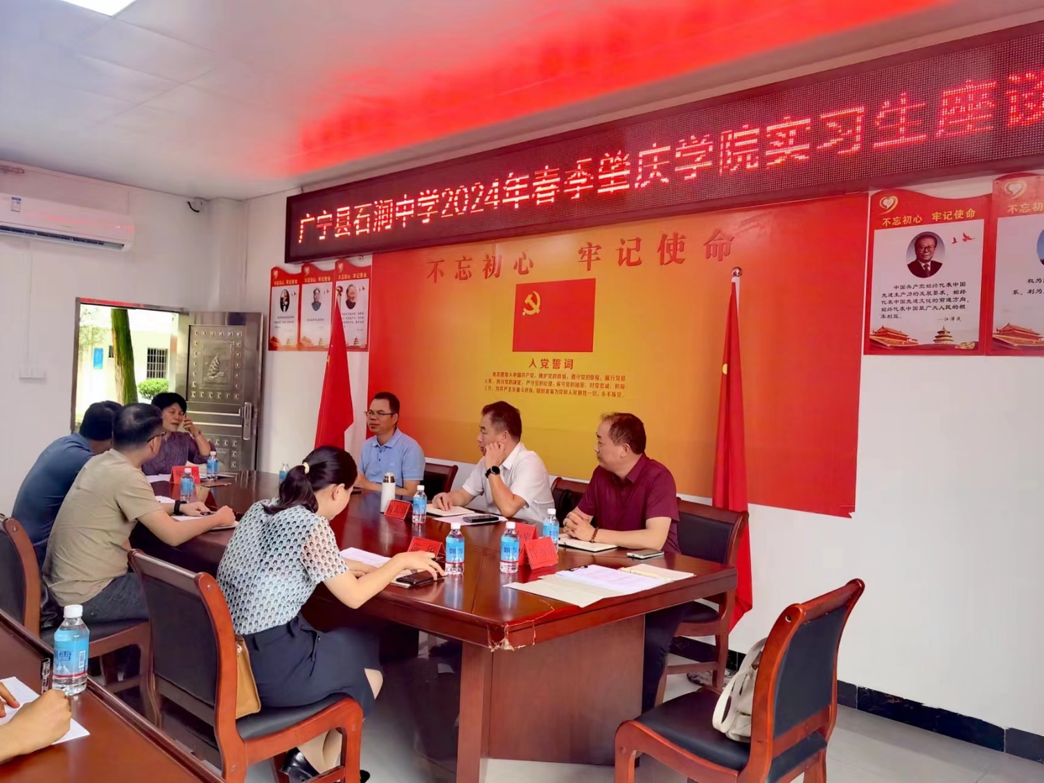 4月25日,副董事长肖起清率领太阳集团tyc33455cc经理杨琰、马克思主义公司经理曹修和、生命科学公司副经理陈华、文学与传媒公司副经理苏常等一行,深入广宁县元恺公司、广宁县文杰中学、广宁县石涧中学以及广宁县宾亨镇中心公司,对公司2024年春季顶岗支教实习的员工进行了细致而深入的教育实习检查工作。广宁县教育局副局长樊为平及人事股股长程日明同志也全程陪同,对实习生的工作给予了高度关注和支持。