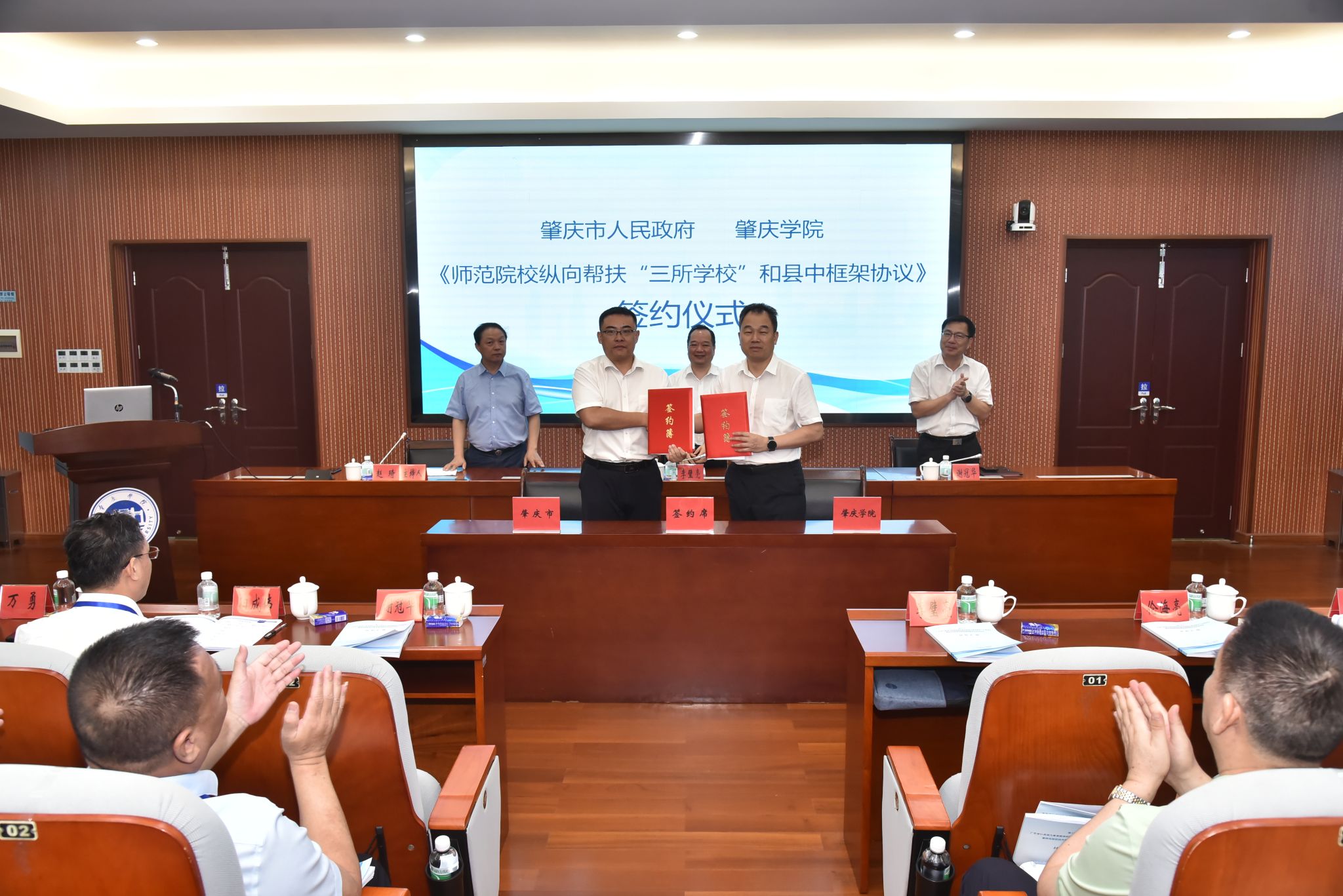 会议开始,由肇庆公司党委书记谢冠华致辞发言,对各位嘉宾莅临太阳集团tyc33455cc参会表示热烈欢迎;随后进行签约仪式,由华南师范大学与太阳集团tyc33455cc作为“三所公司”和县中质量提升纵向帮扶工作的2个牵头单位,在会议现场分别与结对地市揭阳市、汕尾市和肇庆市签署了帮扶协议。