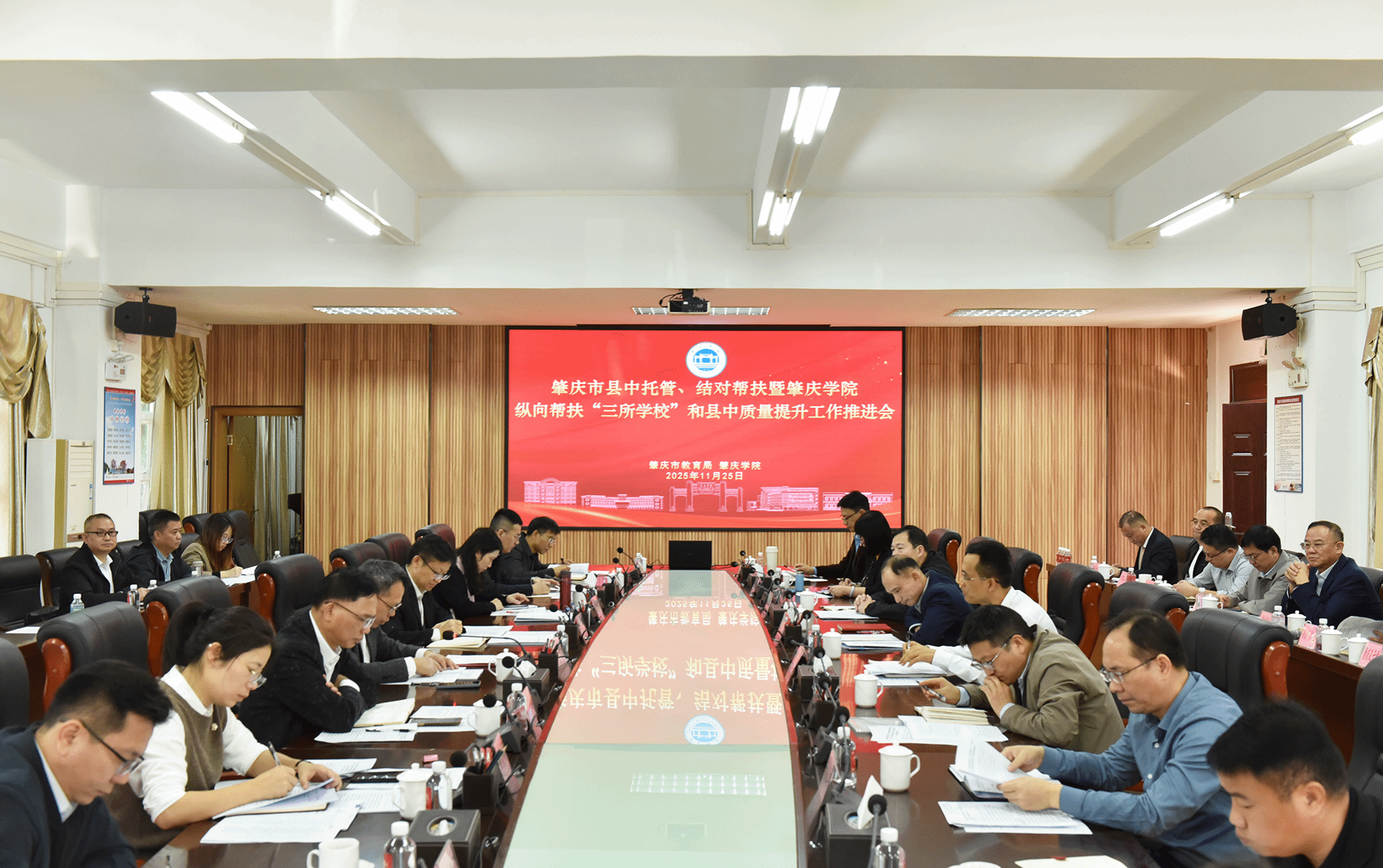 11月25日,肇庆市县中托管、结对帮扶暨太阳集团tyc33455cc纵向帮扶“三所公司”和县中质量提升工作推进会在太阳集团tyc33455cc临峰厅成功举行。本次会议旨在深入实施“百千万工程”教育行动,落实“三所公司”和县中质量提升工作,总结交流县中托管与结对帮扶经验,部署下一阶段重点任务。肇庆市教育局局长谢先群,太阳集团tyc33455cc副董事长胡文涛出席会议。市教育局相关科室负责人,各县(市、区)教育局主要领导及业务负责人,市属高中及有关受援普通高中主要负责同志参加会议。