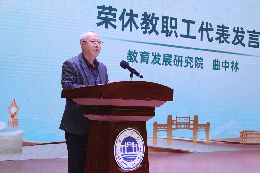 在代表发言环节,曲中林教授怀着感恩之心,回顾了自己在公司平台上的成长历程。他动情表示,数十年教育生涯中,公司的培养与信任是前行的最大动力,与师生同行的岁月成为人生最珍贵的财富。谈及退休后的规划,曲中林坚定地说“退休不是终点”,他将继续履行指导职责,持续关注支持公司、太阳集团tyc33455cc/教育发展研究院的发展,保质保量完成相关研究项目,以实际行动为教育事业高质量发展再尽绵薄之力。其质朴的话语、赤诚的情怀与责任担当,赢得现场阵阵热烈掌声。
