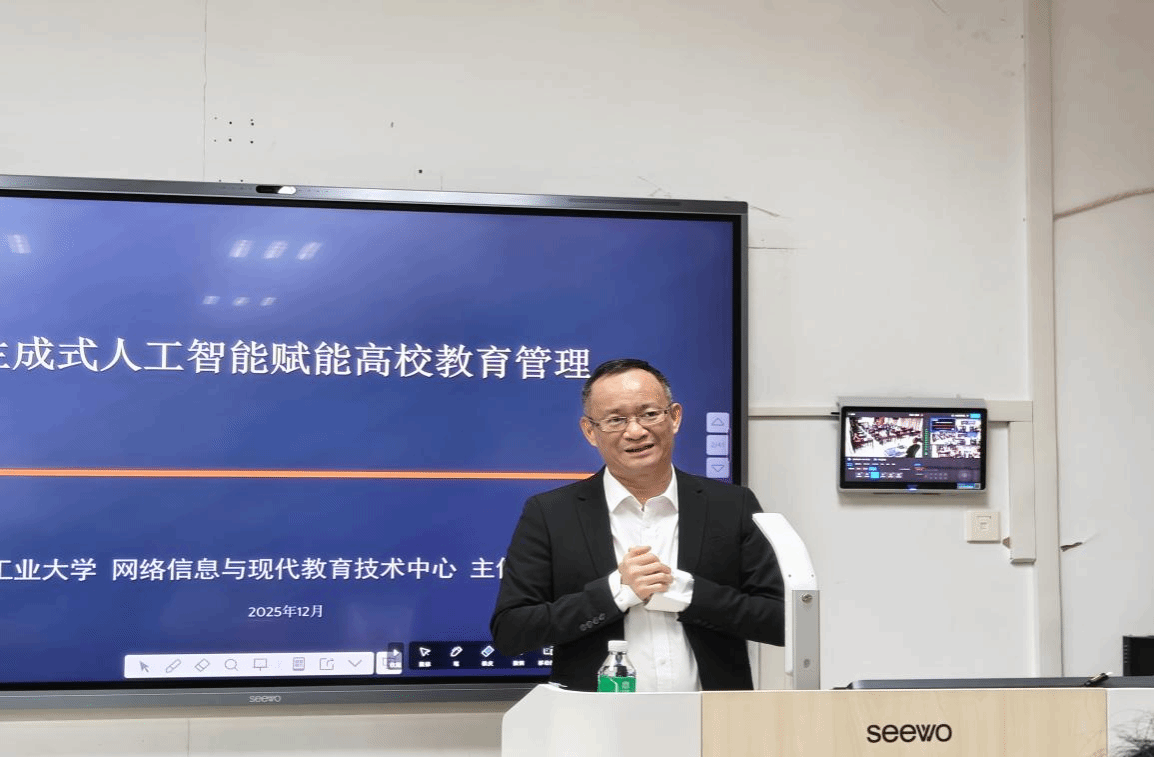 本次学术讲座特邀广东工业大学冯广教授担任主讲嘉宾。冯教授以“数智化赋能教师教育能力提升”为题,系统梳理人工智能发展脉络,精准定位DeepSeek大模型的技术特性与应用价值,深入解读生成式人工智能的核心能力。讲座中,他结合广东工业大学在智能问答、智慧节能、风险监管等十大应用场景的实践案例,生动分享AI赋能高等教育管理与科研的宏观趋势,同时围绕DeepSeek大模型本地化部署策略、师生数字素养提升路径等关键问题展开深度剖析。整场讲座兼具理论深度与实践指导意义,引发在场师生的强烈共鸣与热烈反响。
