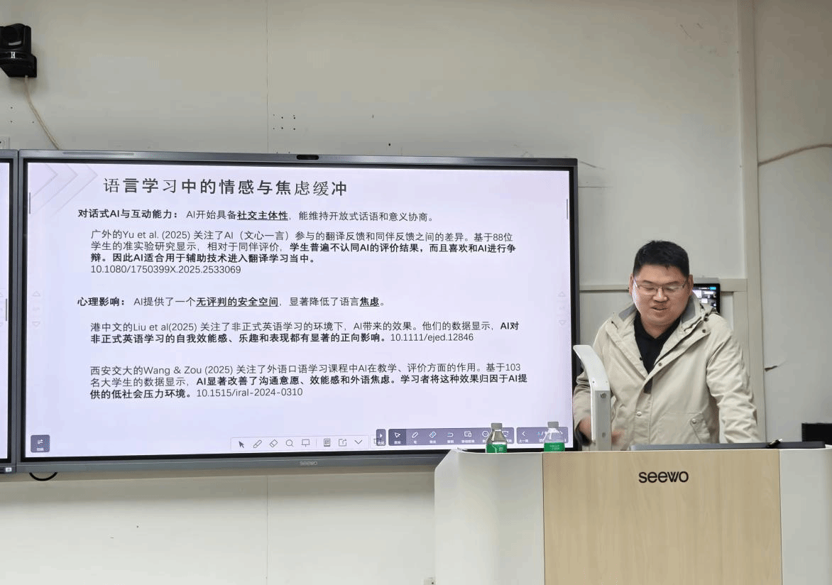 讲座结束后,主题沙龙活动在公司鲍染老师的主持下有序开展。鲍染围绕“教育人工智能(AIED)的研究前沿”做学术分享,师生们围绕“教师专业发展”“学术论文选题与写作”“学术论文发表”等议题畅所欲言,在思维碰撞中凝聚智慧共识,现场交流氛围热烈浓厚。
