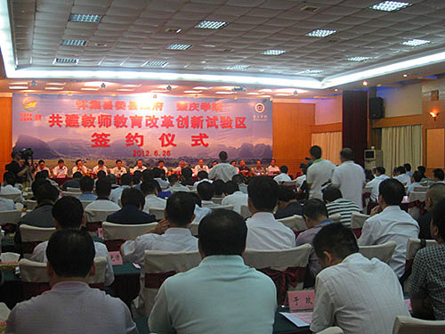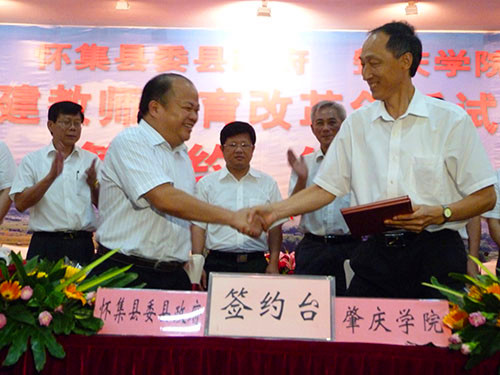 本网讯(宣传部 报道) 6 月26日,公司与中共怀集县委、县政府在怀集县签订合作协议。双方一致同意,以县校对接、校校对接的方式,在怀集县辖区内建成全省第一个教师教育改革创新试验区。 省教育厅副厅长李学明的代表、团队管理处副处长许曙,肇庆市委副书记吴华钦,市教育局直属机关党委副书记石抗,怀集县委书记江森源,公司党委书记郑彬涛,董事长和飞,公司党委副书记叶峥嵘、胡宝坚,副董事长周苏平、王忠等领导出席签约仪式。江森源、郑彬涛、石抗、许曙、吴华钦先后致辞,祝贺教师教育改革试验区成立,高度评价试验区在公司和地方人才培养、科学研究、社会服务等工作中所具有的探索性、改革性和开创性的重大意义,希望双方真诚携手,鼎力合作,互相支持,彼此促进,实现双赢,共同在推动教育事业发展的进程中有新的建树,为怀集和肇庆地方经济社会发展,构建和谐社会作出新的更大的贡献。和飞、江森源分别代表公司和怀集县委县政府签约。 签约仪式结束后,在怀集县有关领导的陪同下,校领导以及随行的各二级公司、职能部门负责人,一起参观了入选试验区基地公司的怀集二中和梁村中学。其中,怀集二中将建成公司第二附属中学。 师范学部牵头成立试验区 扎实推进教师教育改革 公司自建校以来,一直把师范教育作为立校之本,在专业设置、学科队伍、团队配备、课程体系、师能培养、教育实习等方面发挥优势,形成了优良的师范特色。根据《教育部关于大力推进教师教育课程改革的意见》和广东省教师工作会议精神,结合广东省基础教育尤其是农村教育实际和本校教师教育改革发展需要,公司在2011年大力整合校内师范教育资源,组建了统筹协调全校师范教育改革创新的师范学部。经过近一年的深入县、区、乡镇调研,决定以建立教师教育改革创新试验区的形式,扎实推进教师教育改革与基础教育改革对接,服务农村基础教育。 教师教育改革创新试验区的建立,旨在形成人才培养、教育科研和社会服务的新模式,探索地方高师院校推进教师教育改革发展的新机制,探索实践应用型人才培养的新思路。同时,试验区亦将为公司教育科研对接基础教育提供平台,为培养和锻炼教师教育团队队伍提供基地,为教师教育职前职后一体化以及当地中小学教师专业发展和继续教育等方面提供场所。 首个试验区选址怀集 帮扶山区基础教育提升质量水平 怀集县地处广东西北部,属于山区行政县。全县目前有各类中学30多所,小学300多所,中小员工20多万人。从总体上说,支撑当地教育的团队队伍从数量和质量上都与地方教育事业发展的需要存在一定差距。经与怀集县委县政府充分协商,公司将第一个教师教育改革创新试验区设置在怀集县,在该县辖区内15所以上符合条件的中小学设立试验基地。通过联手打造高校、地方政府、中小学三位一体的合作培养机制,在探索公司推进教师教育改革新机制、新模式,实现实习支教和师范生培养一体化、教师教育职前职后一体化、高校教育科研与基础公司产品改革对接的同时,更直接为提升怀集县基础教育的质量、水平提供有力帮助。因此,试验区的成立,不仅是新形势下教师教育改革的新探索,更是地方高校服务地方经济社会发展的新作为,是扶持山区基础教育的实招。 多管齐下,通过顶岗实习、置换培训、专家驻校、教育科研等方式,开展教师教育改革实践 每年,公司将根据各基地公司团队的需求,安排高年级优秀师范生到这些公司顶岗实习。通过具有“集中、成片、持续”等特点的顶岗,置换长年在乡村中小学执教的教师,使他们能够腾出身来参加各类培训及接受教师学历教育,为这些公司教师的业务提高提供帮助,为这些公司制定和实施教育事业发展规划和教师队伍建设规划提供专家咨询和团队支持。 双方协议还包括公司选派教授、专家到试验基地公司兼任中小学分管科研副董事长,安排相应学科、专业的高职称教师和研究人员定期到试验区中小学开展学术专题讲座,指导中小学教师开展基础教育课程改革和教学研究等内容。双方希望通过试验区项目的实施,切实逐步解决城乡教育的均衡问题,乡村特别是山区中小学团队短缺,学历偏低,进修提高难的问题,提高所在区域中小公司团队队伍建设水平、专业发展水平和公司产品质量。 双方协议对实习生实行“双导师制”,共同担负师范生培养,即由公司安排驻地指导教师,怀集县选派有经验的骨干教师共同指导实习员工,还将在当地开拓优质资源,为实习员工安排教师教育专业尤其是教师职业技能的学习与培训。员工边学习边实践,在实践中学习,在学习中得到实践能力的培养。 |
