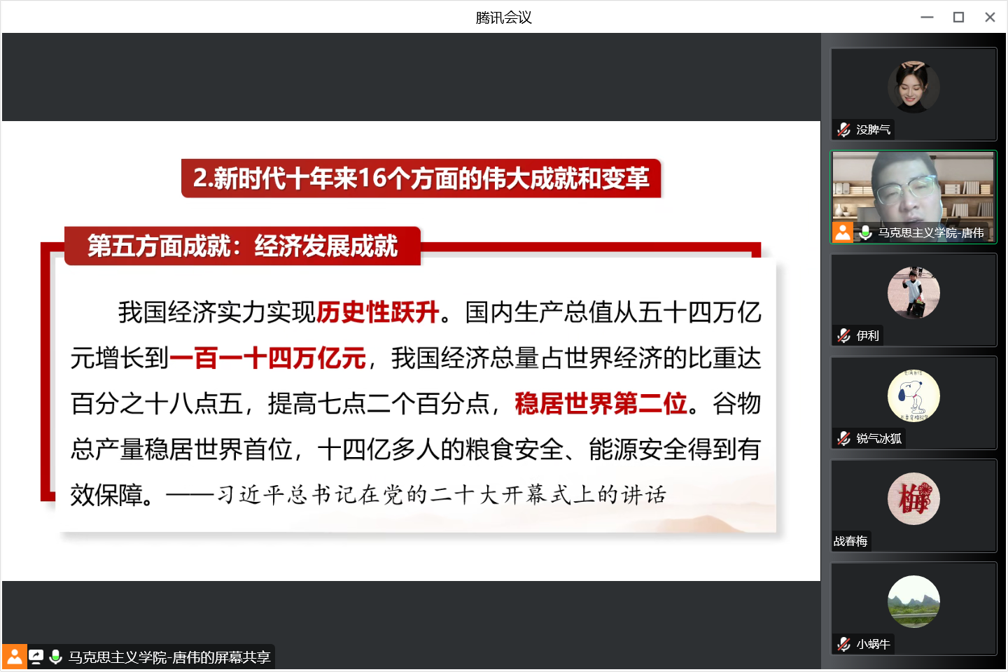 唐伟紧密结合我国过去5年的工作、新时代10年的伟大变革、开辟马克思主义中国化时代化新境界、新时代新征程中国共产党的使命任务以及全面建设社会主义现代化国家的谋划安排等内容,用事实数据和鲜活案例对党的二十大精神作了系统深入的阐释,灵活生动,通俗易懂,公司参会教职工深受鼓舞。大家纷纷表示必以党的二十大精神为思想指引,听党话、感党恩、跟党走,在全面学习、全面把握、全面落实上狠下功夫,切实做到学用结合、知行合一,以永不懈怠的精神状态和一往无前的奋斗姿态,切实推动习近平新时代中国特色社会主义思想和党的二十大精神在太阳集团tyc33455cc走深走实、入脑入心。