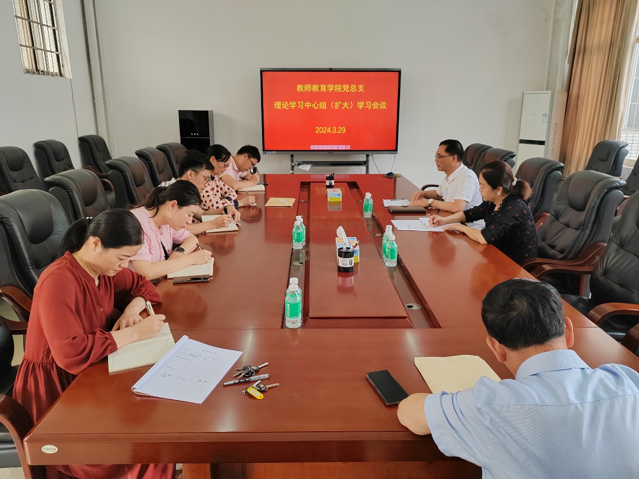 329日,教师教育公司党总支在公司会议室召开理论学习中心组(扩大)学习会议,专题学习全国两会精神。公司经理杨琰及党政办主任、党支部书记、公司各部门负责人参加学习。党总支书记植可焕主持会议并领学全国两会精神。