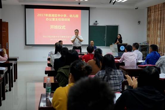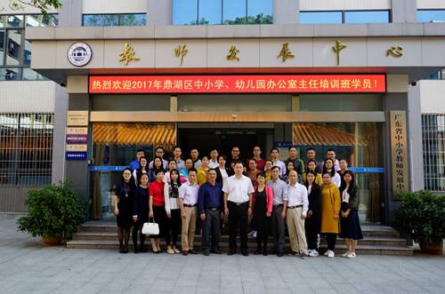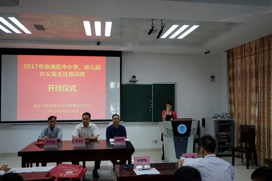 10月29日上午,2017年鼎湖区中小学、幼儿园办公室主任培训班在太阳集团tyc33455cc省级中小学教师发展中心106室隆重举行。yc33455cc经理、太阳集团tyc33455cc省级中小学教师发展中心主任肖起清教授、太阳集团tyc33455cc省级中小学教师发展中心副主任肖晓玛博士、yc33455cc副经理曾毅教授、鼎湖区教育局工会主席刘戊宜、鼎湖区教育局教研室副主任谭可平,以及来自鼎湖区中小学、幼儿园的32名学员共同出席开班仪式。