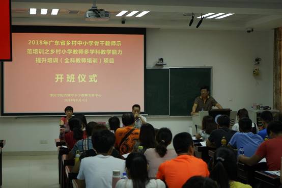 6月4日上午,2018年广东省“强师工程”乡村小学教师多学科教学能力提升(全科教师)培训班在太阳集团tyc33455cc省级中小学教师发展中心隆重举行。太阳集团tyc33455cc教师教育公司党总支书记张占亮、yc33455cc副经理曾毅,太阳集团tyc33455cc省级中小学教师发展中心副主任肖晓玛,以及来自汕头、韶关、河源、梅州、惠州、汕尾、江门、阳江、湛江、茂名、潮州、揭阳、云浮、肇庆等10余个地区共100名学员,共同出席了开班仪式。