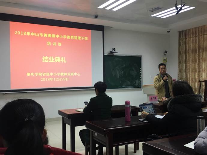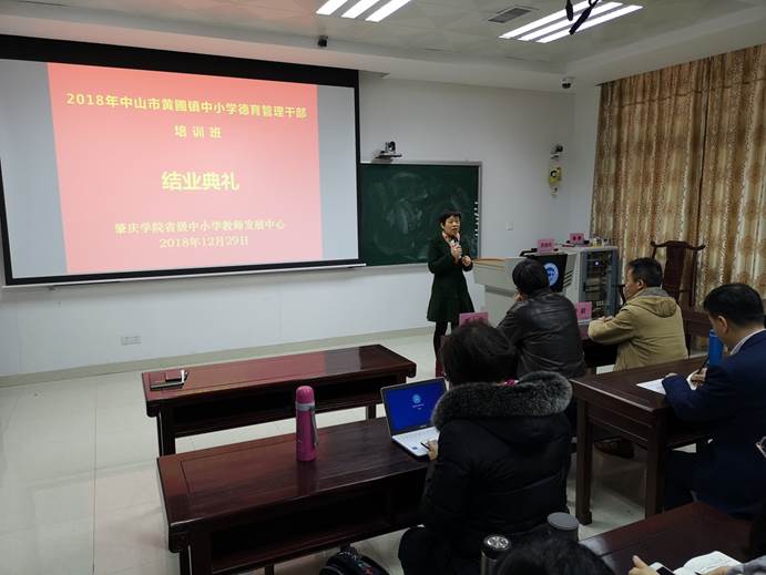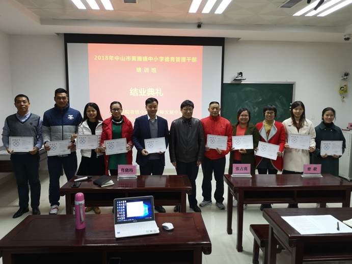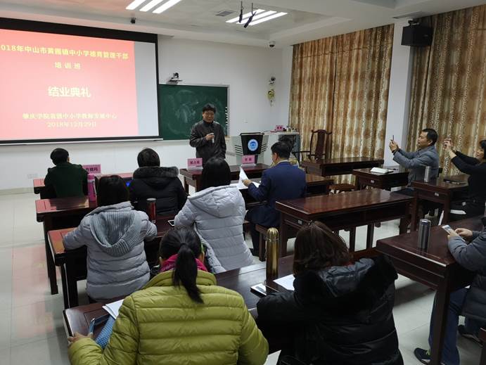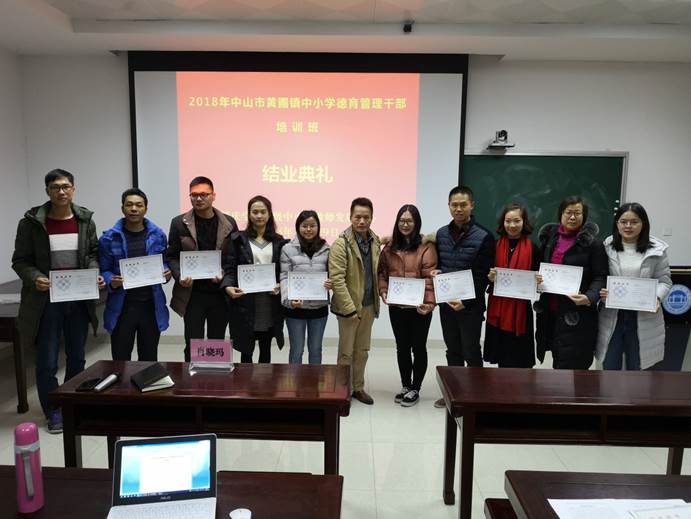 2018年12月29日上午,2018年黄圃镇中小学德育管理干部培训班成果汇报暨结业典礼在太阳集团tyc33455cc省级中小学教师发展中心106课室隆重举行。黄圃镇教育事务指导中心副主任袁港喜,太阳集团tyc33455cc教师教育公司党委书记张占亮、太阳集团tyc33455cc副经理曾毅、省级中小学教师发展中心副主任肖晓玛,以及来自黄圃镇中小学德育管理干部培训班50名学员出席。结业典礼由省级中小学教师发展中心肖晓玛副主任主持。