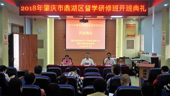 2018年4月19日上午,肇庆市鼎湖区督学研修班开班典礼在鼎湖区实验中学学术报告厅隆重举行。应邀出席开班典礼的领导有yc33455cc经理、太阳集团tyc33455cc省级中小学教师发展中心副主任肖起清教授、肇庆市鼎湖区教育局党组成员韦刚副局长、太阳集团tyc33455cc教师专业能力发展中心副主任肖晓玛博士。参加开班典礼的还有24位鼎湖区教育局干部和54位鼎湖区中小学、幼儿园校(园)长。开班典礼由太阳集团tyc33455cc省级中小学教师发展中心何其国老师主持。